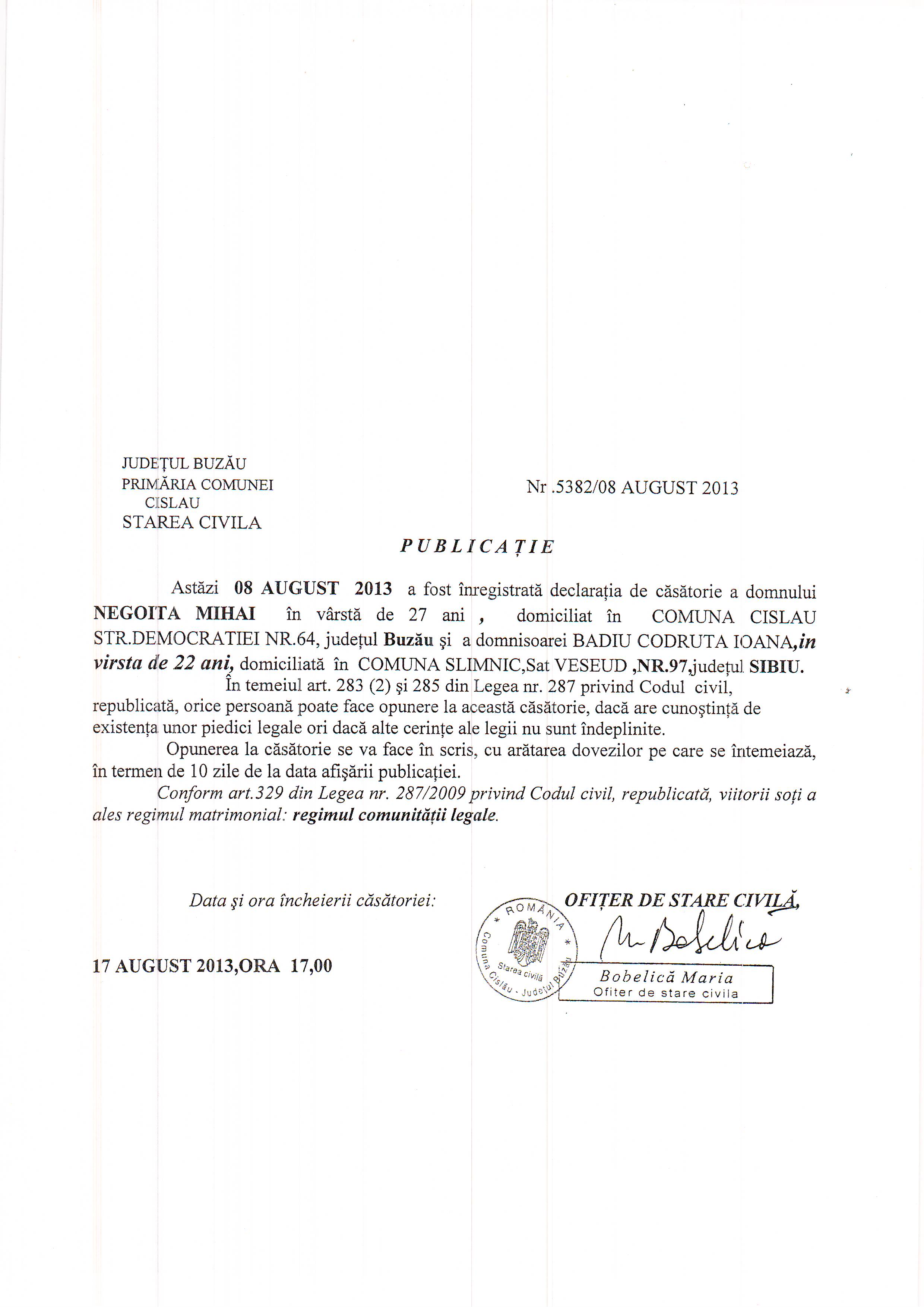 » Publicatie casatorie - 17.08.2013 - Negoita Mihai si Badiu Codruta Ioana